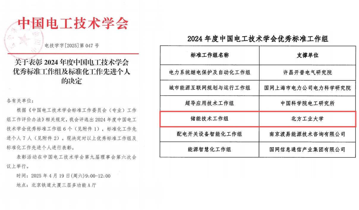 近日,中国电工技术学会发布《关于表彰2024年度中国电工技术学会优秀标准工作组及标准化工作先进个人的决定》,贝博官网“储能技术工作组”获得“2024年度中国电工技术学会优秀标准工作组”的荣誉称号,贝博官网参编的T/CES 251-2023《储能系统变流器涉网性能硬件在环检测规范》工信部百项团体标准应用推广典型案例。