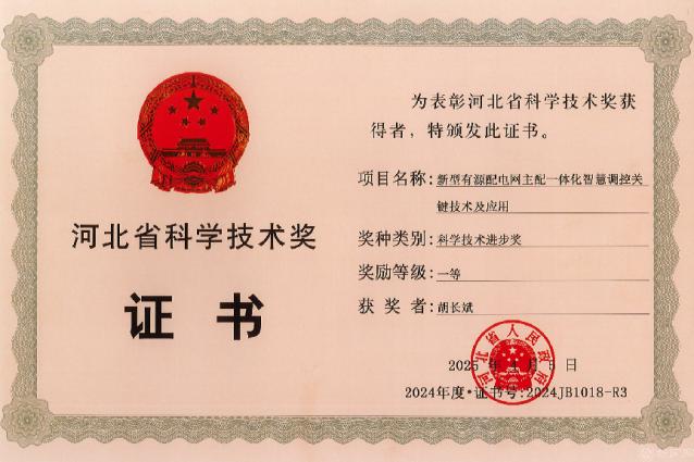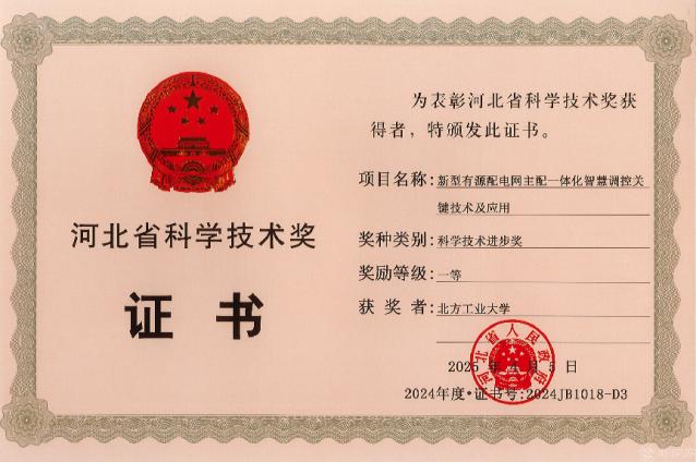 近日,河北省人民政府公布了2024年度河北省科学技术奖获奖名单,贝博官网电气与控制工程学院胡长斌教授参与的“新型有源配电网主配一体化智慧调控关键技术及应用”获评河北省科学技术进步奖一等奖。
