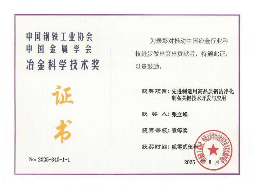 近日,冶金科学技术奖奖励委员会正式公布了2025年度中国钢铁工业协会与中国金属学会联合颁发的冶金科学技术奖获奖名单。在此次评选中,张立峰校长团队的科研成果——“先进制造用高品质钢洁净化制备关键技术开发与应用”荣获一等奖。张立峰校长为该项成果的第一完成人,贝博官网为第二完成单位,其他参与单位还有北京科技大学、首钢集团有限公司、江阴兴澄特种钢铁有限公司、中国第一重型机械股份公司、邯郸钢铁集团有限责任公司、石家庄钢铁有限责任公司、上海梅山钢铁股份有限公司、南京钢铁股份有限公司、唐山钢铁集团有限责任公司。
