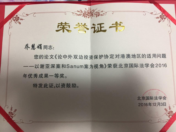 贝博官网文法学院法律系乔慧娟副教授提交的论文“论中外双边投资保护协定对港澳地区的适用—以谢亚深案和Sanum案为视角”喜获2016年北京国际法学会优秀成果一等奖,并作为获奖代表接受外交部条法司徐宏司长颁奖。