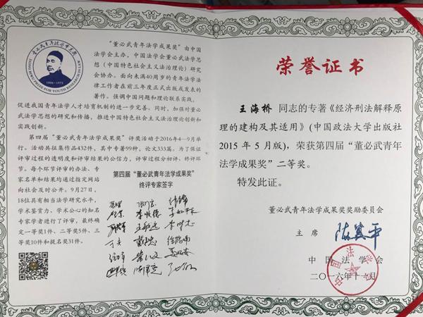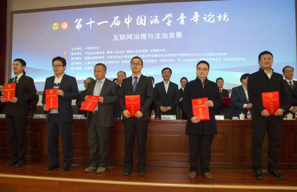 11月18日,以“互联网治理与法治发展”为主题的第十一届中国法学青年论坛在国家检察官学院举行。中国法学会会长王乐泉,最高人民检察院党组书记、检察长曹建明出席论坛开幕式并讲话。中国法学会党组书记、常务副会长陈冀平主持开幕式。开幕式上举行了第四届“董必武青年法学成果奖”的颁奖仪式。贝博官网王海桥副教授荣获二等奖,应邀出席青年法学论坛开幕式并作为获奖代表接受最高人民检察院党组书记、检察长曹建明颁奖。