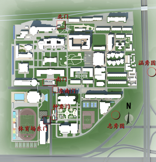 同时,为了方便师生的教学、生活,规范学校形象标识的使用,学校还新确立了北门、南门、东南门、钟秀门、体育场东门五个校门,并进行了挂牌。具体位置请参照下图: