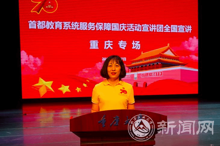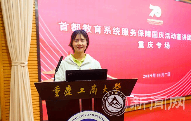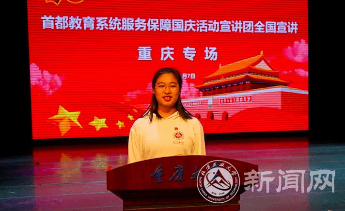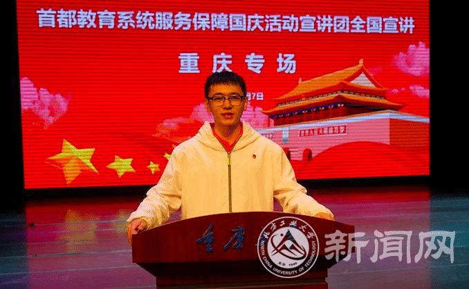 宣讲团成员辅导员库颖,群众游行学生代表蒋云飞、江泠睿,联欢活动学生代表张震、祖力哈亚提·艾力,国庆志愿者学生代表付潼,后勤保障组学生代表邱佳汇,向与会师生分享了服务保障国庆活动的精彩过程,生动的故事、动情的讲述,引发了重庆师生的强烈共鸣。