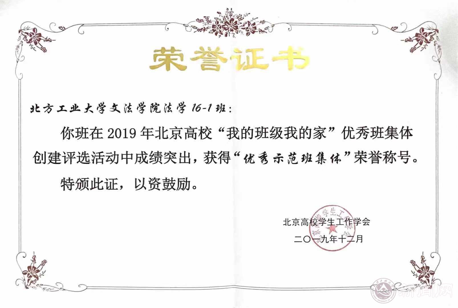 12月20日,2019年北京高校“我的班级我的家”优秀班集体创建答辩评选会在北京工业大学举行。贝博官网文法学院法学16-1班获得北京高校“优秀示范班集体”称号。