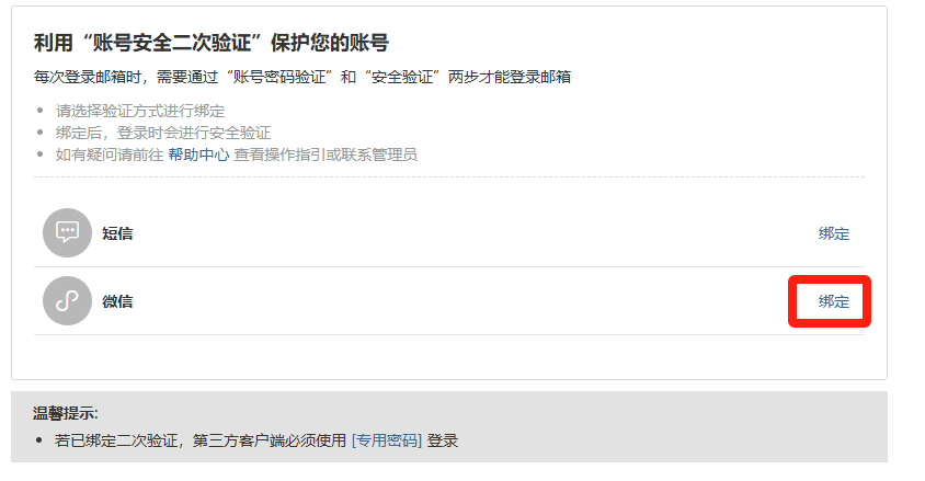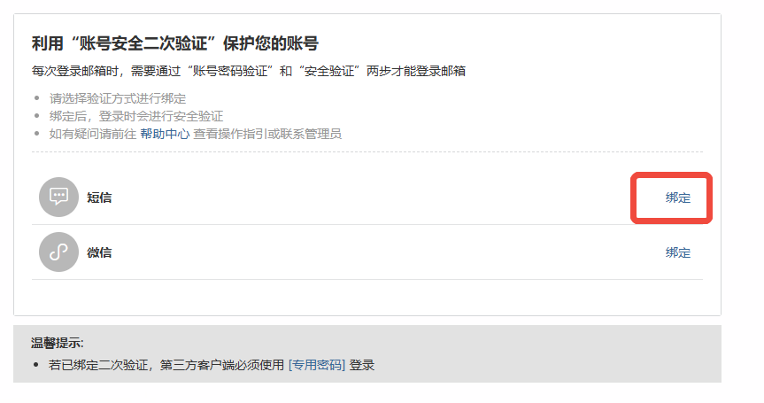 1.已绑定用户:通过企业微信、FoxmailOutlook等第三方客户端需要重登录,登录必须使用【客户端专用密码】与日常登录密码不同)。