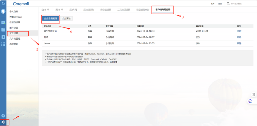 c)     客户端专用密码设置,设置-》安全设置-》客户端专用密码,客户端密码可设置多个但每个只显示一次
