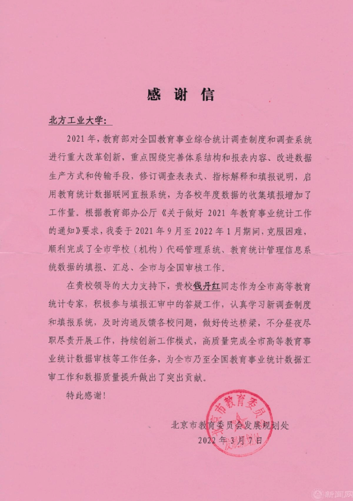 3月7日,学校办公室收到北京市教委发来的感谢信。信中指出,贝博官网钱丹红同志作为全市高等教育统计专家,在2021年9月至2022年1月期间,积极参与填报汇审中的答疑工作,认真学习新调查制度和填报系统,尽职尽责开展工作,持续创新工作模式,高质量完成全市高等教育事业统计数据审核等工作任务。