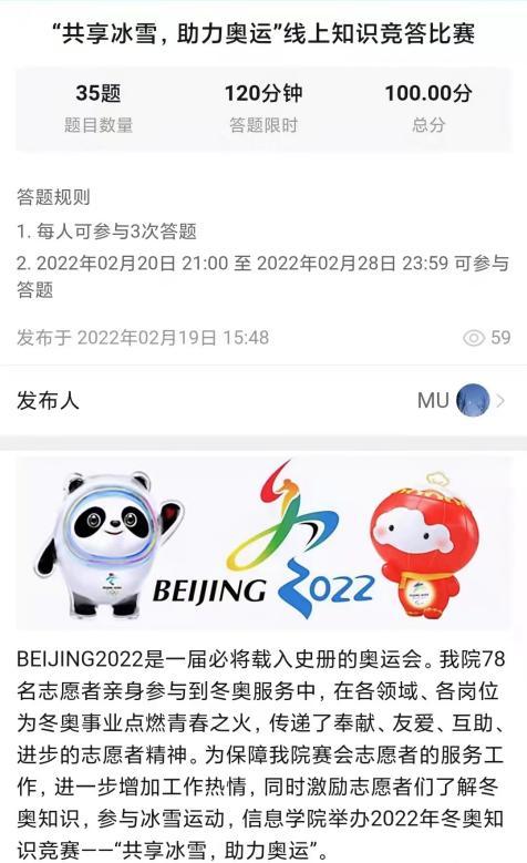 本次活动面向全校冬奥志愿者,有近200余名同学参与,旨在通过对冬奥会和冬残奥会的知识竞答,激发大家在冬残奥会服务中的工作热情,进一步引领志愿者“支持冬奥、服务冬奥、参与冬奥”。为严格落实疫情防控要求,活动采用微信小程序的方式在线云答题。竞赛题目内容丰富,范围涵盖冬奥会的发展史、中国历届和本次冬奥会取得的成绩、运动员的体育精神等方面,借此传播奥林匹克文化,传递奥林匹克精神,增强爱国热情。