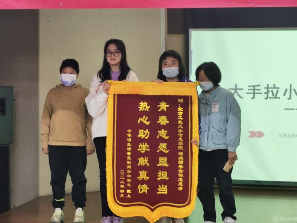 近日,信息学院师生应邀前往石景山区京原路7号“社区青年汇”参加助学志愿服务活动总结座谈会。座谈会对学院师生参与开展助学志愿活动进行了总结,受助学生和家长为大学生助学志愿者送上一面写着“青春志愿显担当热心助学献真情”的锦旗表示感谢。