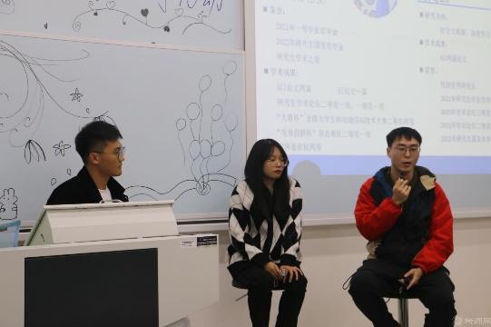 11月2日,第二场访谈会由邸昊天主持,通过一人提问两人回答的形式,与陈馨和张天璞就怎样与导师有效沟通、如何缓解研究生期间的心理压力等生活问题进行探讨;与刘梦欣和孙宇就如何确定研究方向、怎样申请国家奖学金等研究生高度关注的学业问题,与国奖得主进行深入交流。