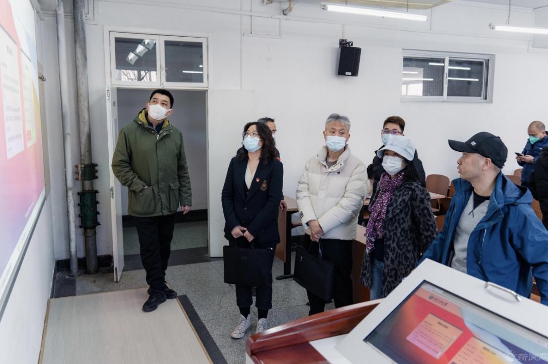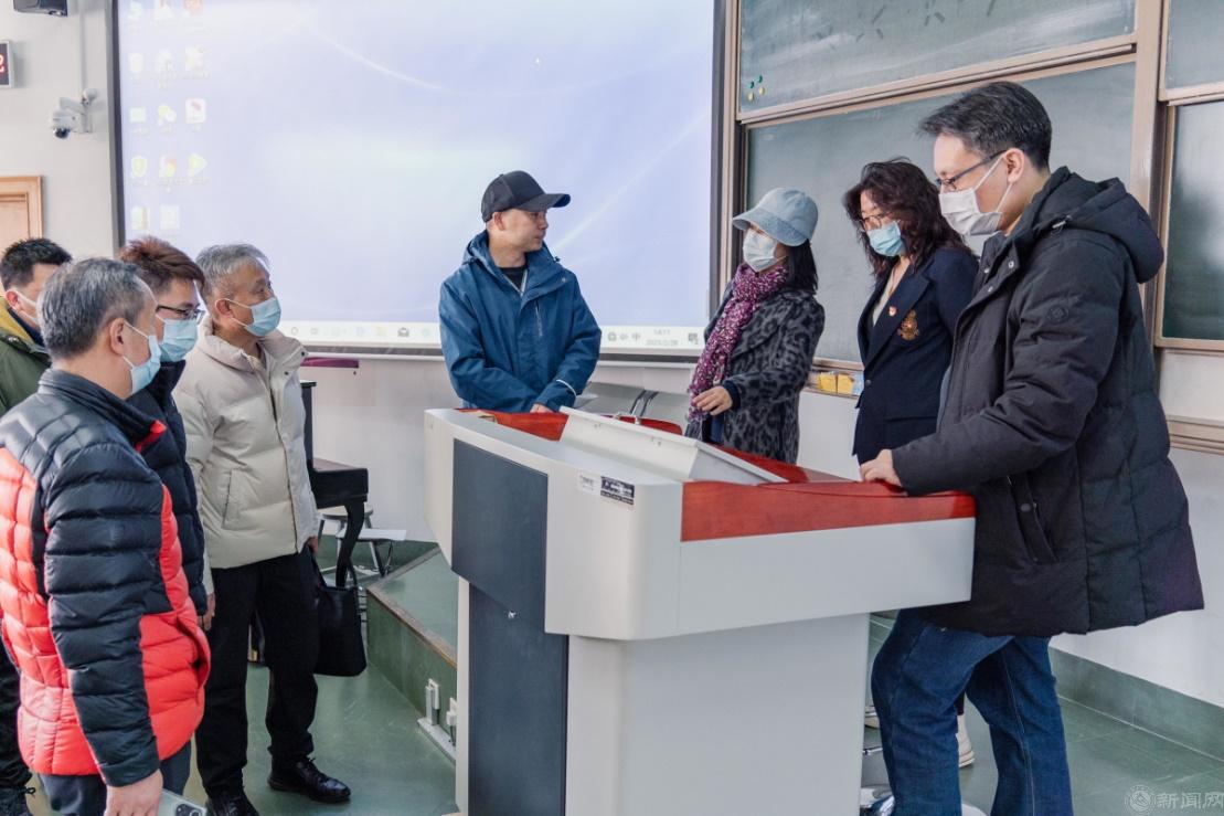 在李敏副主任、网信中心教育技术部负责人王岸飞的引领下,一行人先后前往广学楼、瀚学楼和励学楼教室现场观摩、考察。李敏向来访领导介绍了贝博官网最近几年的多媒体教室升级改造项目的相关情况及目前的现状,王岸飞介绍了教室多媒体的系统构成、功能和特点,并进行了演示。