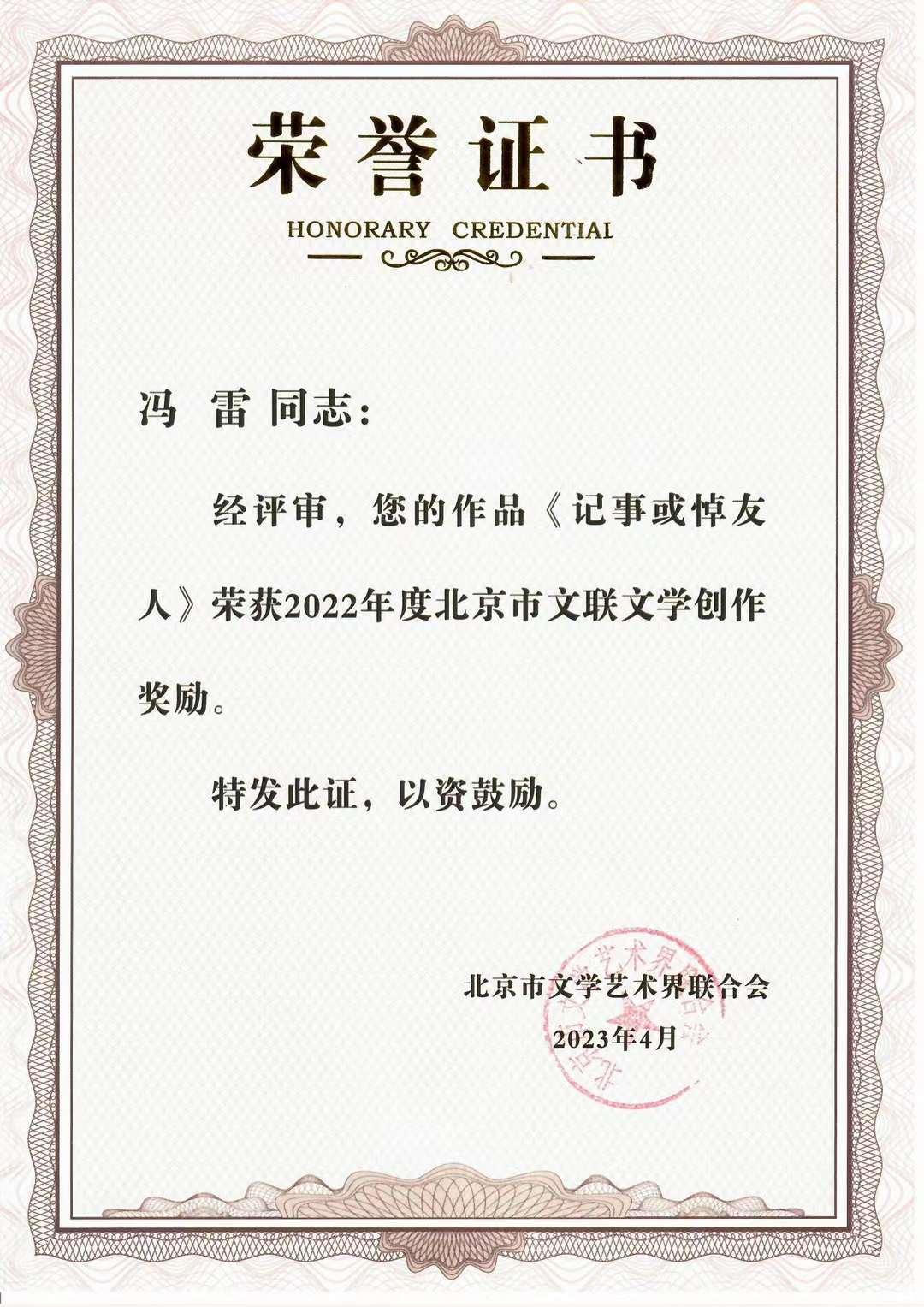 日前,北京市文学艺术联合会在老舍剧场举办“2022年北京市文联文学创作奖励颁奖典礼”。贝博官网文法学院冯雷副教授凭借文学作品《记事或悼友人》获得奖励,作品发表在《北京文学》2022年第3期。