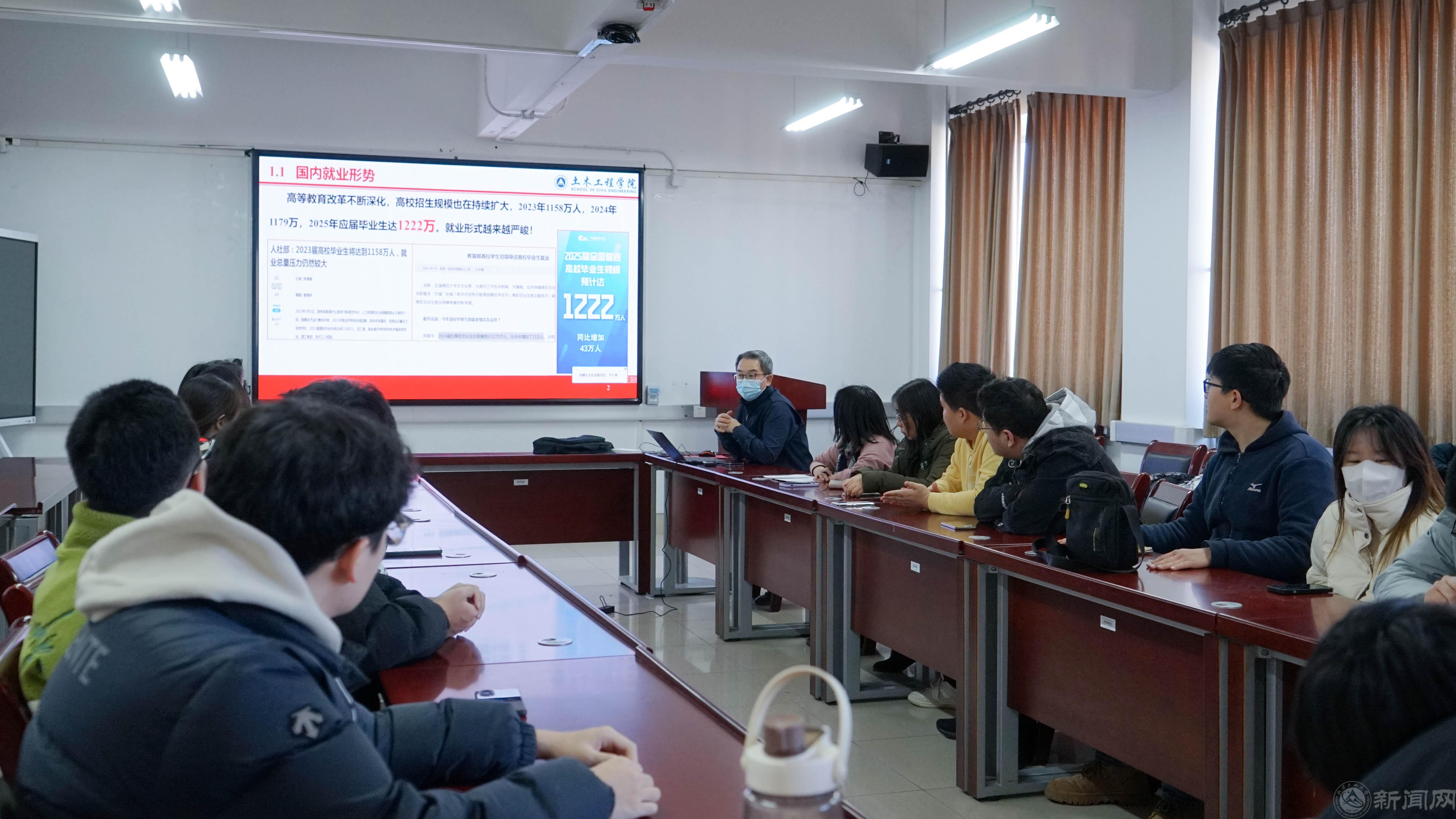 为持续推动2025届毕业生就业工作走深走实,帮助同学们认清当前就业形势、调整就业心态,以更理性的态度对待就业过程中的挑战与机遇,土木工程学院于2024年12月27日至2025年1月3日,面向2025届本科毕业生、以班级为单位召开就业工作推进会。会议由学院党委副书记冯少杰主持,毕业班班导师、就业辅导员和2025届全体毕业生参加会议。