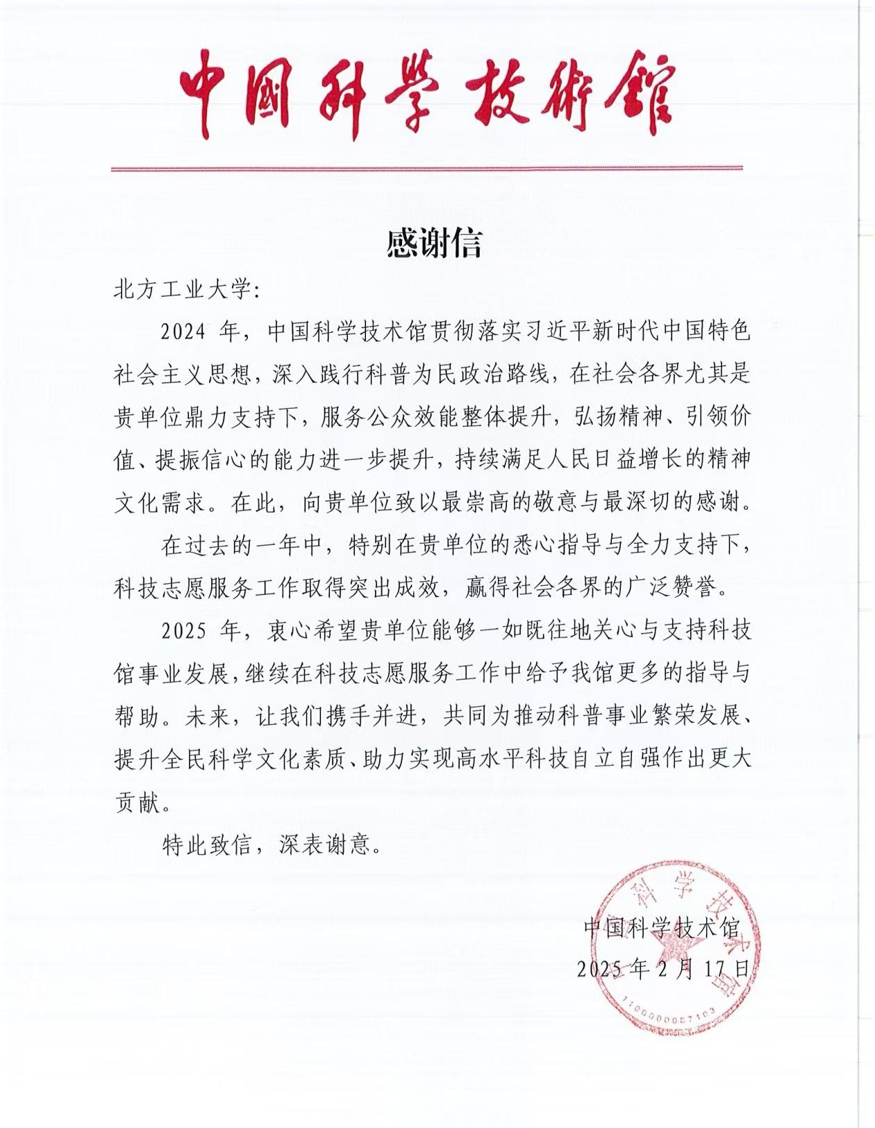 近日,中国科学技术馆向贝博官网发来感谢信,感谢贝博官网机材学院学生过去一年中在中国科技馆志愿服务中的出色表现。这一封真诚的感谢信不仅代表着对贝博官网志愿服务工作的认可,也是对志愿者们无私奉献和推进科技科普工作的鼓励。