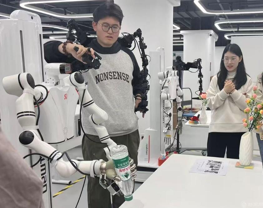 在数据训练中心,负责人张钦锋介绍,中心设有20余个机器人学习场景,涵盖抓瓶子、抽纸巾、叠毛巾、拧螺丝、采摘果实、按按钮等抓取和装配日常任务。数据采集师每日通过标准化流程为机器人“授课”,单名操作员日均可生成百余条数据,年数据产量超百万条。师生现场观摩了机器人动态避障、柔性抓取等高难度训练,并就数据标注、算法优化等关键技术展开研讨。