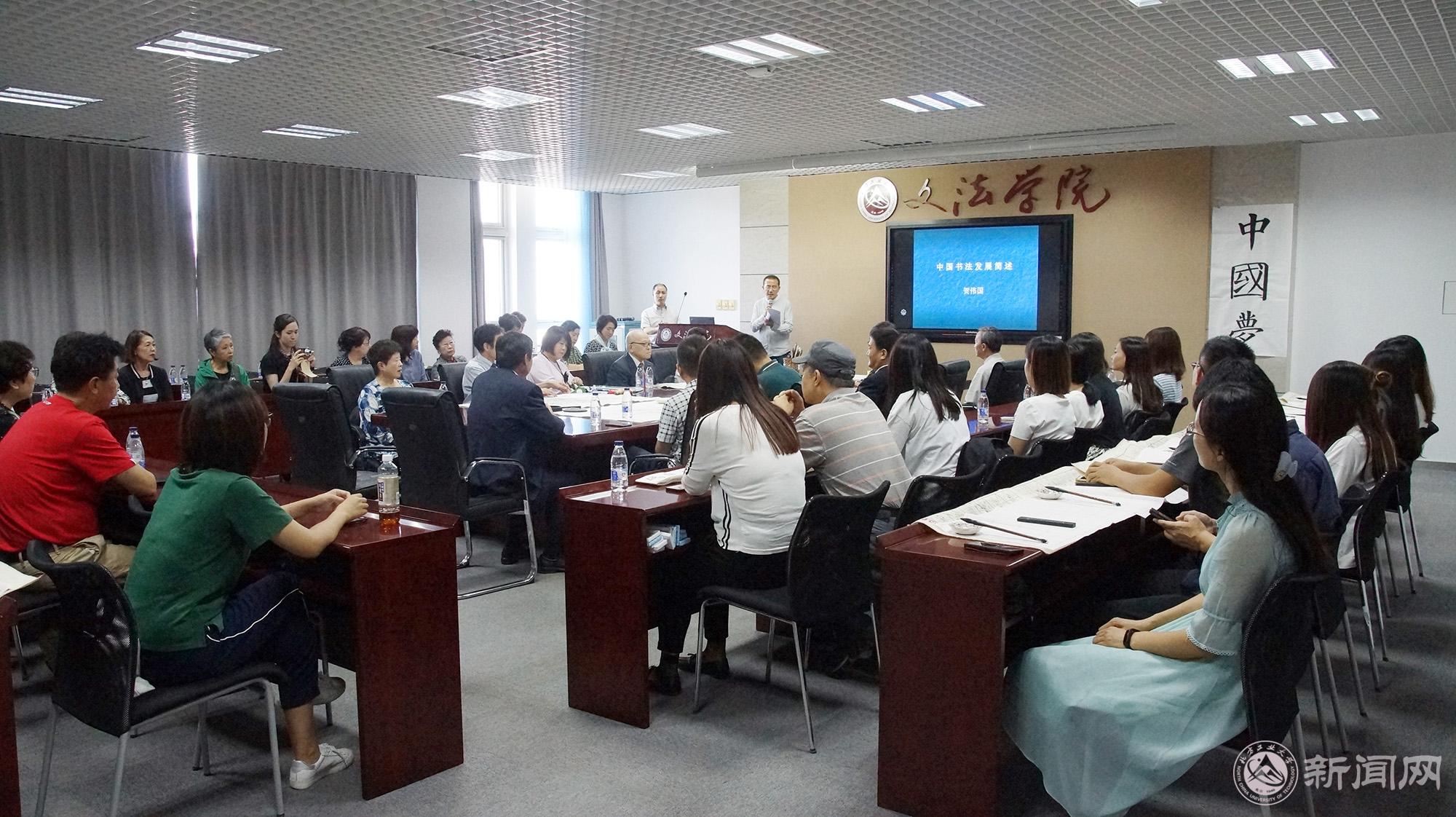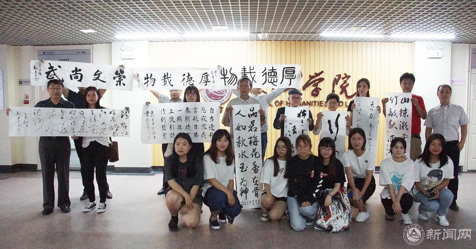 交流活动由文法学院中文系主任王德岩主持,日语系梁长岁老师担任翻译。国家大学生素质教育基地、文法学院领导及师生,校书画协会,贺良朴艺术研究会贺伟国会长及部分学员,与全日本书艺学院访华团一行17人进行了学术和艺术交流。日方代表介绍了日本书法和书法教育的历史沿革及现实发展,展示了日本当代书法作品。贺伟国会长做了《中国书法发展略述》的精彩讲座并进行了生动的现场书法教学。