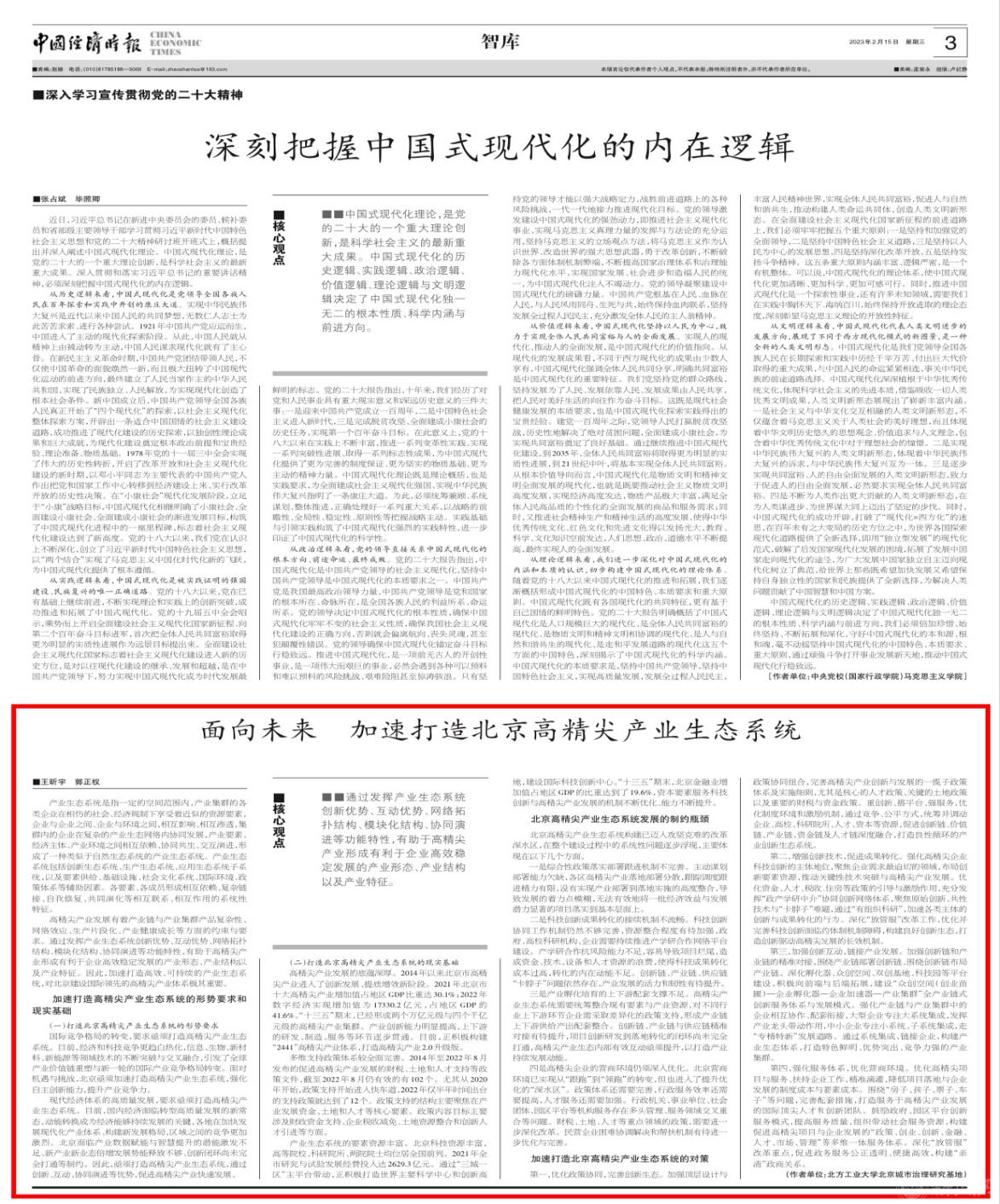 2月15日,《中国经济时报》“智库”栏目刊发贝博官网经济管理学院王昕宇副教授、郭正权教授的理论文章《面向未来 加速打造北京高精尖产业生态系统》。该文章依托贝博官网北京城市治理研究基地,在对北京高精尖产业发展深入研究的基础上,指出通过发挥产业生态系统创新优势、互动优势、网络拓扑结构、模块化结构、协同演进等功能特性,有助于高精尖产业形成有利于企业高效稳定发展的产业形态、产业结构以及产业特征,并就加速打造北京高精尖产业生态系统提出相应政策建议。
