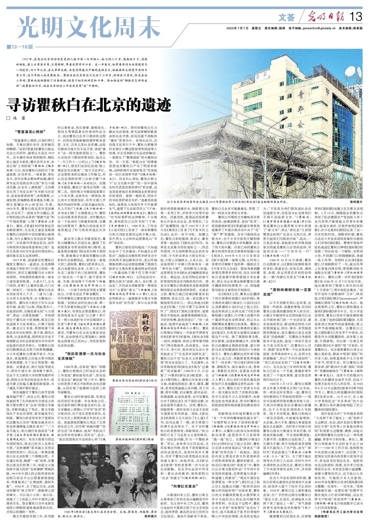 7月7日,《光明日报》在第13版以整版的篇幅发表了贝博官网文法学院中文系副教授冯雷的文章《寻访瞿秋白在北京的足迹》,全文8000余字。