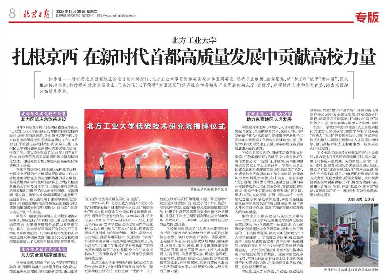 12月26日,《北京日报》第8版(专版)以《扎根京西 在新时代首都高质量发展中贡献高校力量》为题,深入报道贝博官网立足高水平应用型大学定位,扎根京西,发挥科研优势、技术优势和人才智力优势,助推新时代首都高质量发展的经验做法。