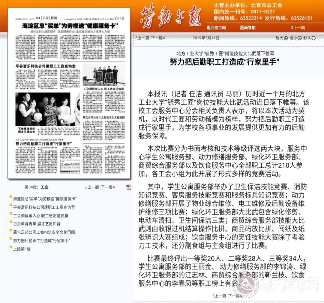 为贯彻落实北京工会十四大精神,积极投身首都改革发展实践,以劳模精神、劳动精神、工匠精神引领职工人生理想,充分展现现代化建设主力军的新时代风采,日前ballBET贝博BB艾弗森服务中心分会组织举办了“毓秀工匠”活动。7月11日,劳动午报发表了贝博官网题为《努力把后勤职工打造成“行家里手”》的署名报道文章。