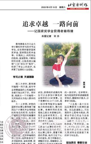 国家奖学金获得者当代大学生中的佼佼者,是品学兼优学生的代表。日前,《北京考试报》在2020年6月13日第4、5版和6月27日第8、9版对贝博官网国家奖学金获得者秦玮婧、杨晓阳、 和文辉同学的事迹进行了报道,体现了北方工大学生在磨砺中出彩,在奋斗中升华的精神风貌。