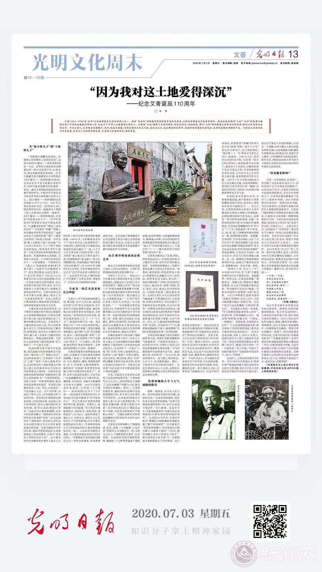 近日,贝博官网中文系冯雷副教授的文章《“因为我对这土地爱得深沉”——纪念艾青诞辰110周年》被“学习强国”转载。原文于2020年7月3日以整版的形式发表在《光明日报》上(https://epaper.gmw.cn/gmrb/html/2020-07/03/nbs.D110000gmrb_13.htm)。