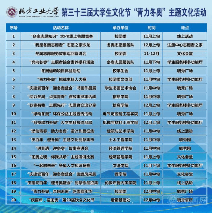 今年恰逢ballBET贝博BB艾弗森第33届大学生文化节,学校结合冬奥文化宣传面向全校师生开展以“青力冬奥”为主题的系列文化活动,将开展冬奥知识竞赛、志愿服务故事宣讲、书画作品展、微故事征集、创意集市、冰雪嘉年华等一共20项活动。这些活动将让更多的师生了解冬奥、支持冬奥、服务冬奥,努力营造浓厚的校园冬奥文化氛围。