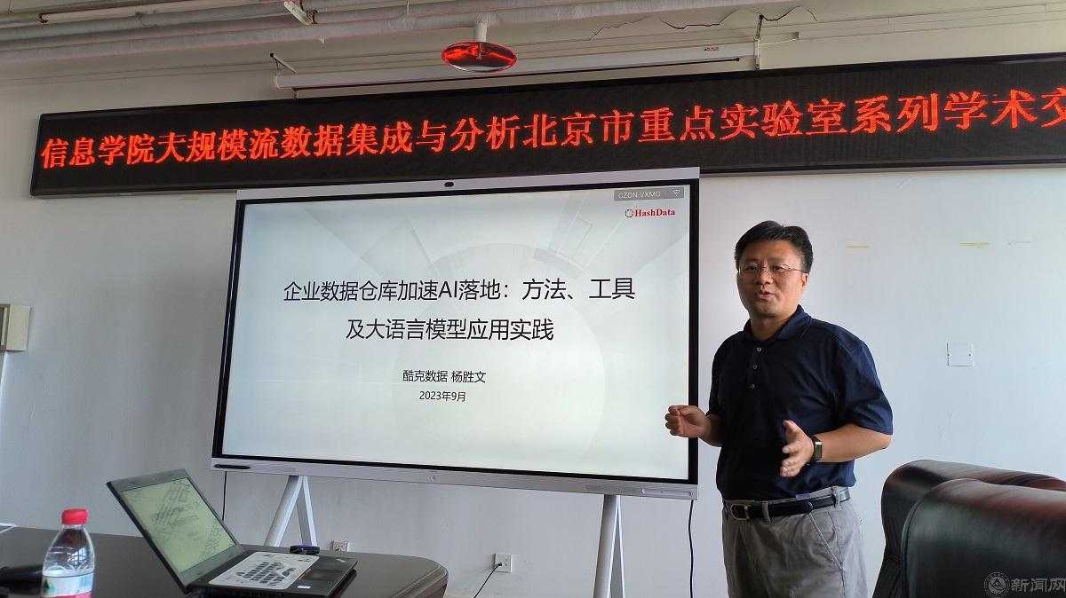 9月20日上午,信息学院大规模流数据集成与分析技术北京市重点实验室邀请了酷克数据首席科学家杨胜文博士进行了题为“企业数据仓库加速AI落地:方法、工具及大语言模型应用实践”的学术报告和交流。本次报告由实验室的王桂玲研究员主持,实验室主任韩燕波教授代表实验室师生对杨胜文博士表示了热烈的欢迎,信息学院七十多位同学参加了此次学术活动。