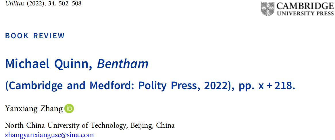 法哲学与道德哲学国际顶尖期刊Utilitas于2022年12月在第34卷第4期刊发了张延祥副教授独立撰写的论文:A Review of Bentham。Utilitas是国际功利主义学会(International Society for Utilitarian Studies)旗下唯一的学术期刊,在人文领域享有崇高声誉,由剑桥大学出版社出版。Utilitas被国际人文研究领域的各个权威期刊目录收录,其中包括Web of Science中的艺术与人文索引目录(A&HCI),在另一权威数据库Scopus的学术期刊排名体系(SJR)中位于Q1区。