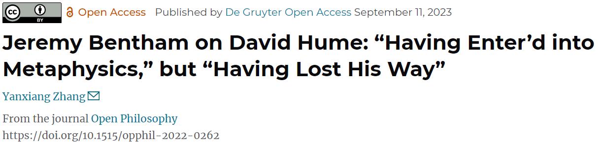 国际哲学权威期刊Open Philosophy于2023年9月13日在线刊发了张延祥副教授独立撰写的长篇研究论文:Jeremy Bentham on David Hume: “‘Having enter’d into Metaphysics’, but “‘Having Lost His Way’”。
