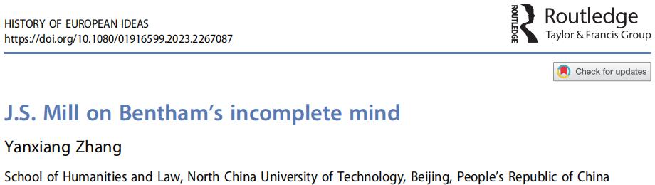 思想史研究领域国际顶尖期刊History of European Ideas于2023年10月9日在线刊发了张延祥副教授独立撰写的长篇研究论文:J.S. Mill on Bentham’s Incomplete Mind。History of European Ideas由当今世界四大学术出版集团之一的Taylor& Francis出版,被国际人文研究领域的各个权威期刊目录收录,其中包括Web of Science中的艺术与人文索引目录(A&HCI),在另一权威数据库Scopus学术期刊排名体系(SJR)中位列Q1区。