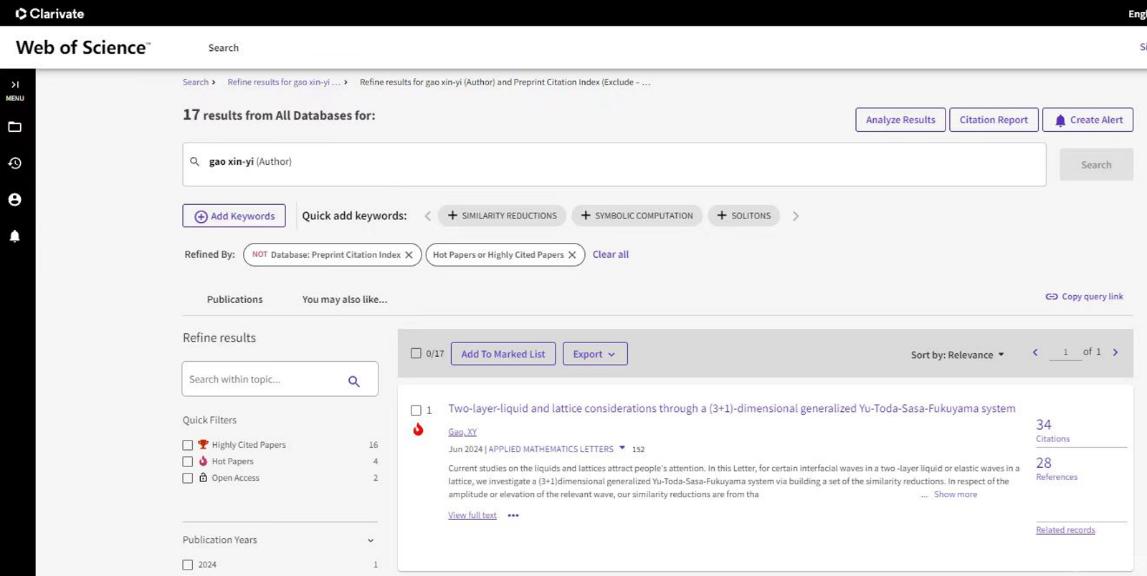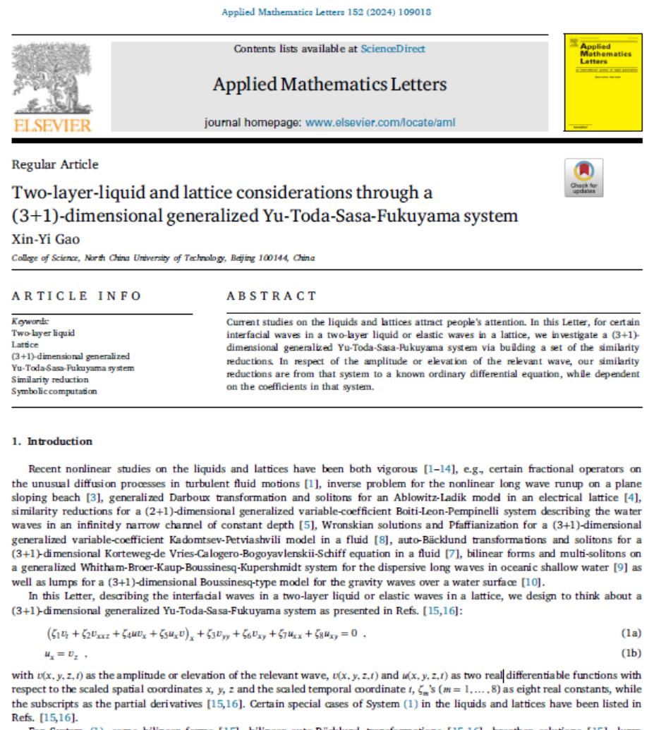 近日,贝博官网理学院教师高心怡在Applied Mathematics Letters(应用数学快报)发表的标题为Two-layer-liquid and lattice considerations through a (3+1)-dimensional generalized Yu-Toda-Sasa-Fukuyama system[通过(3+1)维广义Yu-Toda-Sasa-Fukuyama系统考察双层液体和晶格]的文章入选“ESI热点论文”。