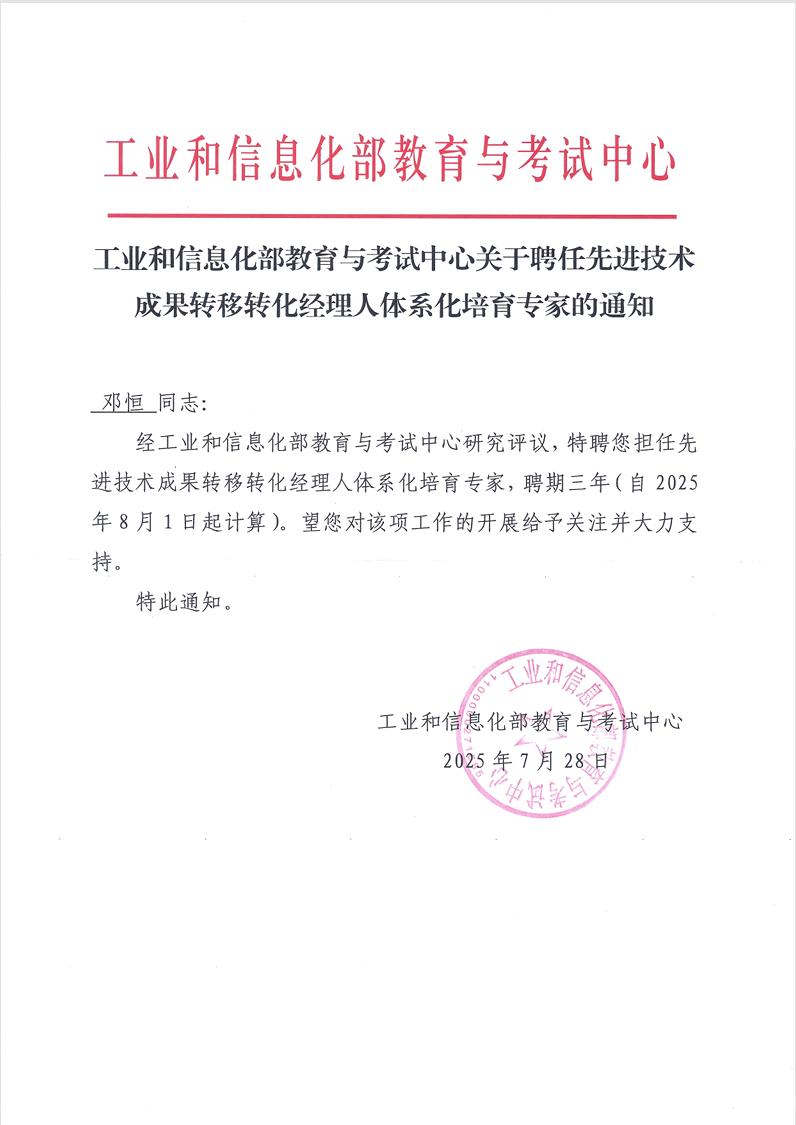 近日,从工业和信息化部教育与考试中心获悉,贝博官网文法学院邓恒教授被聘为先进技术产品转移转化技术经理人培育专家。