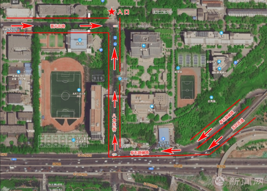2、乘地铁1号线至古城站C口出站,换乘318路公共汽车北方工大站下车(学校南门进入);