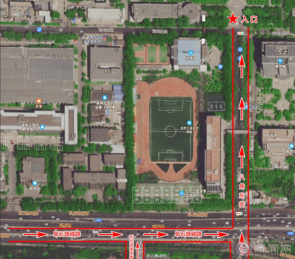 B:阜石路由西向东方向或八角东街由南向北方向进校如下图: