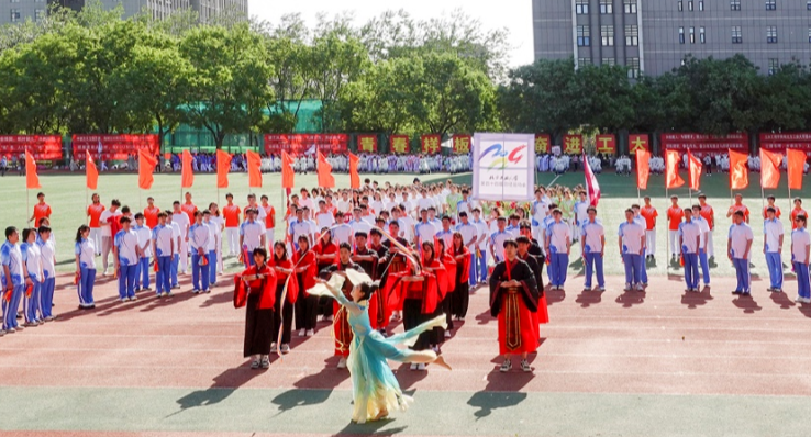 上午8时,伴随着雄壮的运动员进行曲,国旗方队和运动会会徽方队迈着坚定的步伐引领各方队入场。